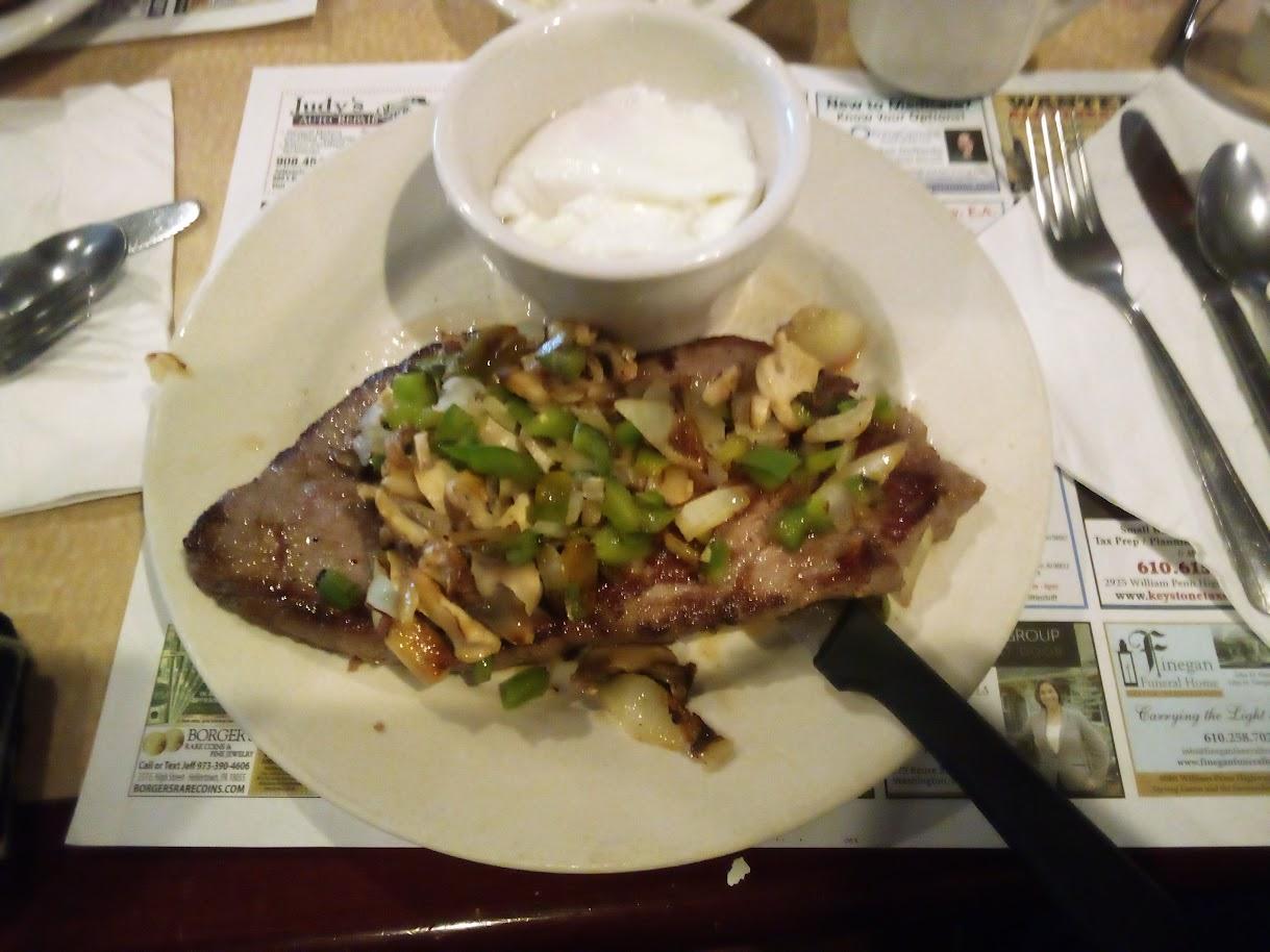 Yesterday (Monday) I was taken out for Breakfast, #steak (Medium Rare with Sauteed #Onions, #Mushrooms, #Peppers) and #eggs - poached - here is the photo